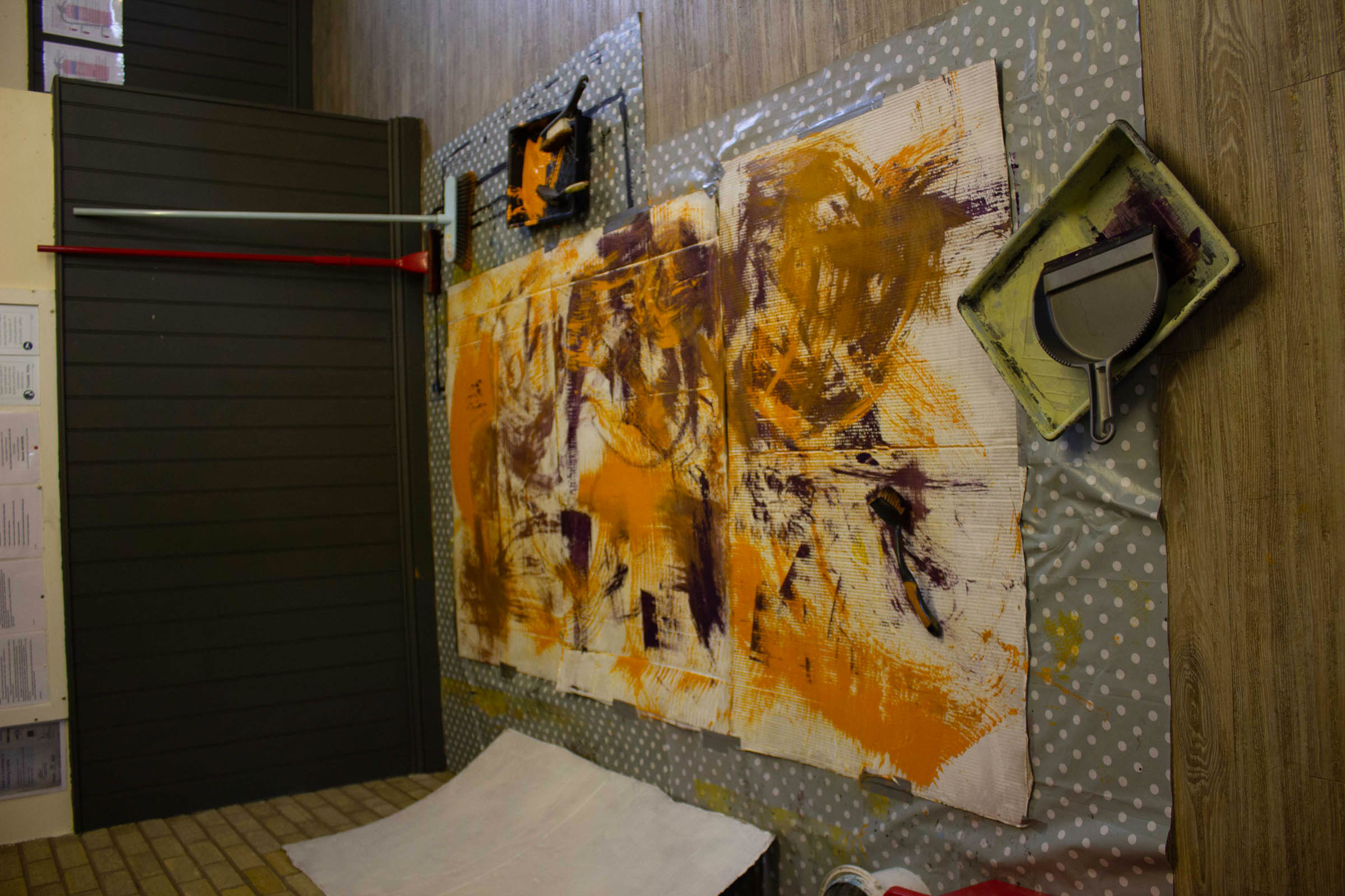 Conclusion: The 3 panels felt a comfortable space again to work in for two people and large gestures. Spacious. The circular forms along with the linear seemed pleasing. The experimental marks were sometimes very surprising when investigating what the materials can do. The artist is then able to see things within.